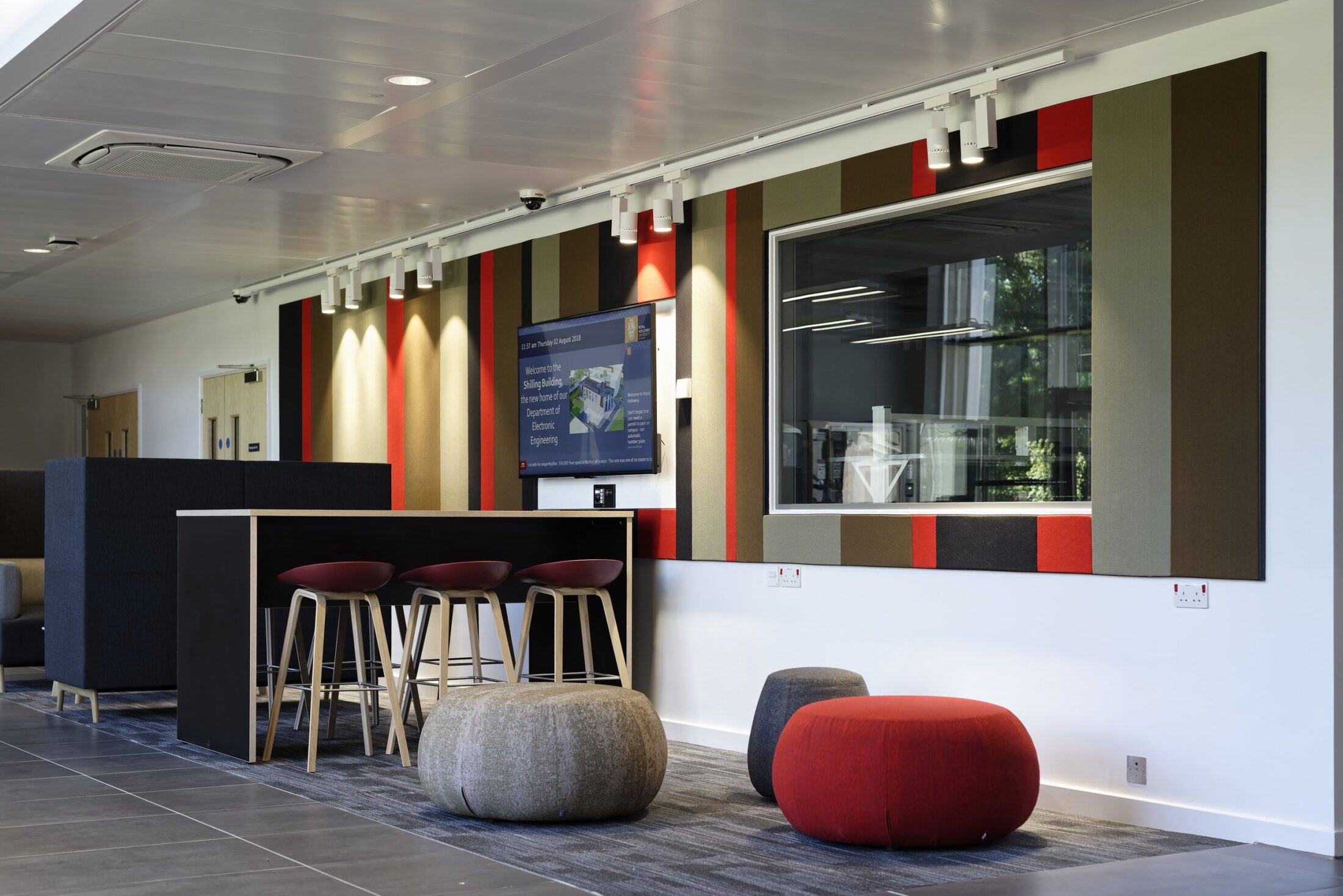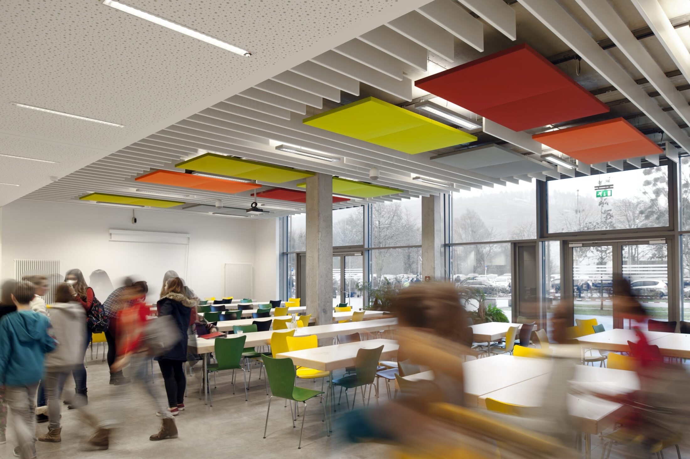 Dans les écoles et universités, les volumes nécessitent une approche acoustique différenciée selon leur destination. On peut distinguer, d’une part, les salles de cours ou d’activité pratique et, d’autre part, les espaces de circulation ou de convivialité (salles polyvalentes et salles de restauration). Dans les premières, quels que soient les âges considérés, c’est l’intelligibilité de la parole qui doit être privilégiée ; dans les seconds, c’est sans doute la maîtrise du bruit de fond qui est prioritaire avec, parfois, le souhait de créer des sous-espaces d’intimité, via des mobiliers désignés sur mesure, pour travailler ou téléphoner tranquillement. Les solutions Texaa permettent de répondre à ces problématiques acoustiques très diverses tout en contribuant à l’architecture par leurs formes et leurs couleurs. Comme dans tout lieu public, leurs qualités de résistance et de facilité d’entretien sont également appréciées.